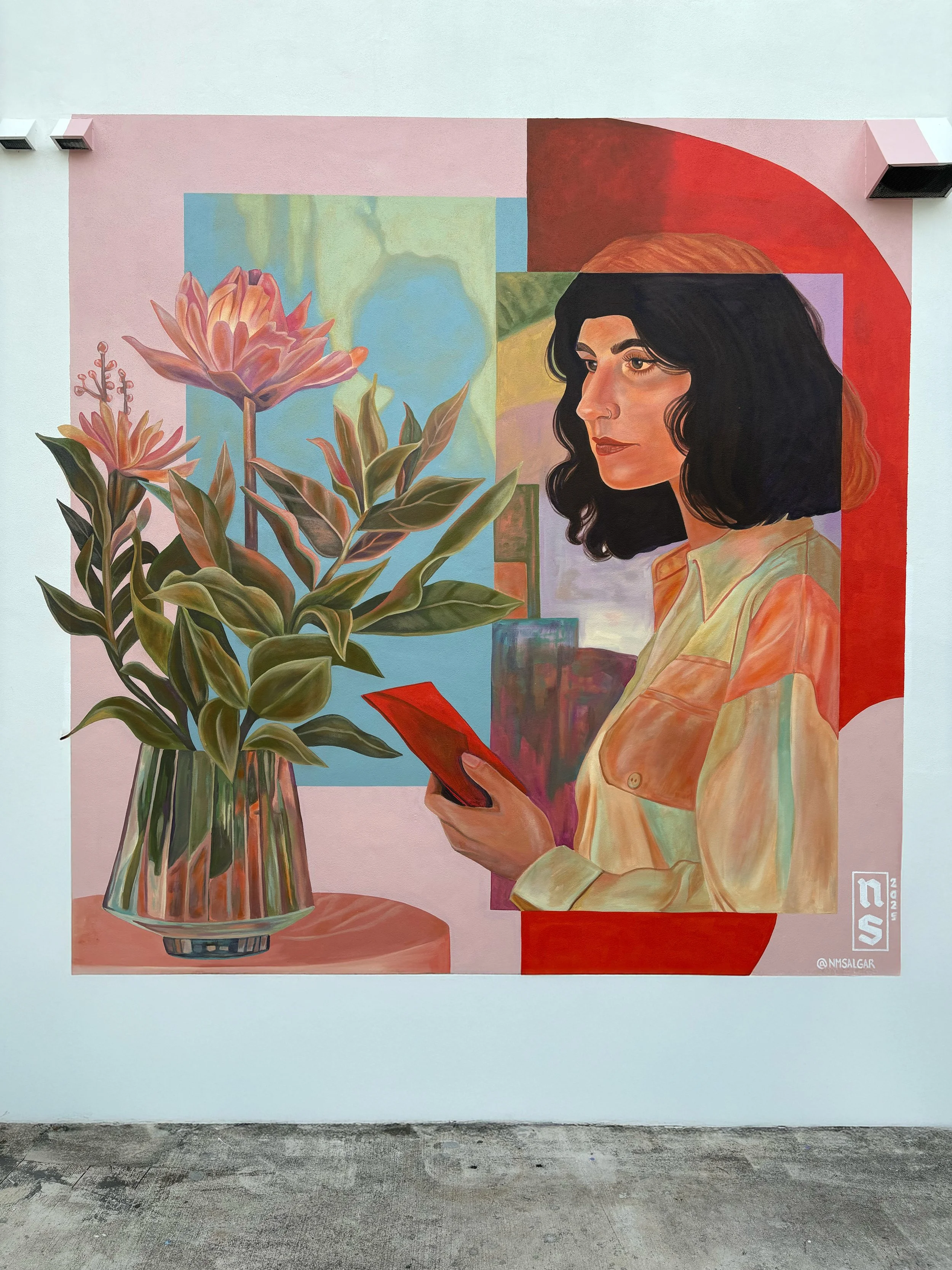 This serene mural, located in the Thrive Arts District of St. Petersburg, Florida, is a beautiful example of the Nicole’s ability to blend portraiture with still life and abstract elements. A woman with a thoughtful expression is depicted holding a red book, her figure framed by a composition that includes a vibrant bouquet of flowers in a striking vase.